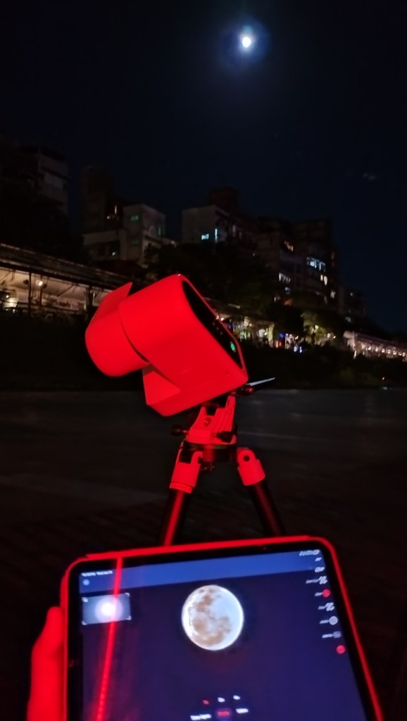 While the scope was pointing to a new DSO target, I let her look at the moon through my camera. There’s skepticism about Seestar—whether it’s AI-generated and just showing what it wants on my iPad—but after seeing the moon through a telephoto lens, the delight in her voice saying “It’s the same!” was amusing. Then I realized there was no SD card and I couldn’t photograph it, so I set up my GoPro to do its thing getting star trails.