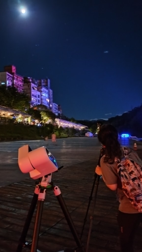 Not ideal since it’s super bright with the riverside restaurant, hanging bridge, and water fountain show that wasn’t turned off until midnight, plus all the residential buildings. But hey, we’re shooting the moon and it’s going to be bright! Luckily it was rising from the south where the mountains are, so we didn’t have to deal with the light pollution coming from Taipei.