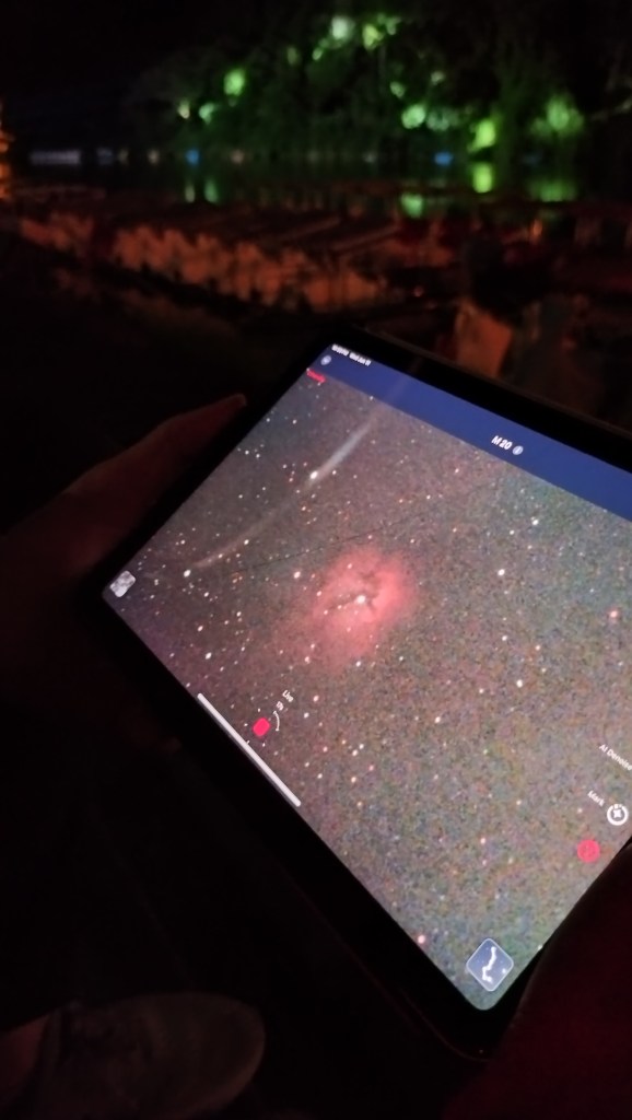 Back to the scope, we looked at M20, or the Trifid Nebula, and the look on her face when the “crack” in the sky showed up on my iPad screen! She said she got goosebumps! After 15 minutes of data, we pointed to another object, NGC 6888 or the Crescent Nebula, which kind of looked more like the outline of a human brain with just 15 minutes of data. Still very pretty to look at. And finally, I added more data to M16 or the Eagle Nebula and explained to her my fascination with the Pillars of Creation, which are at the center of the Eagle Nebula.
