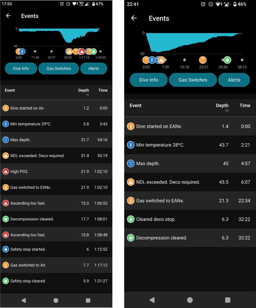 Garmin Dive App: Events of my first deco dive (left) vs my 45m dive (right)