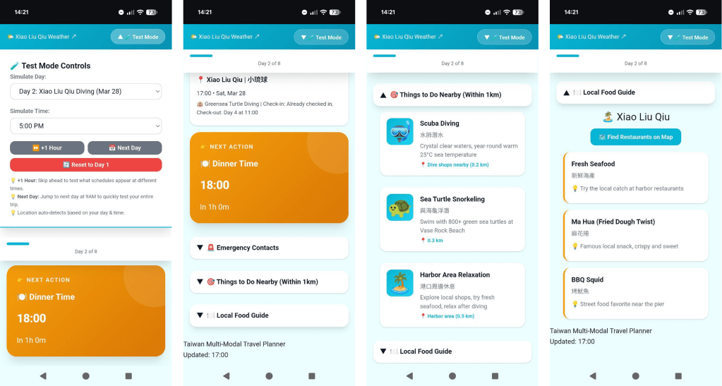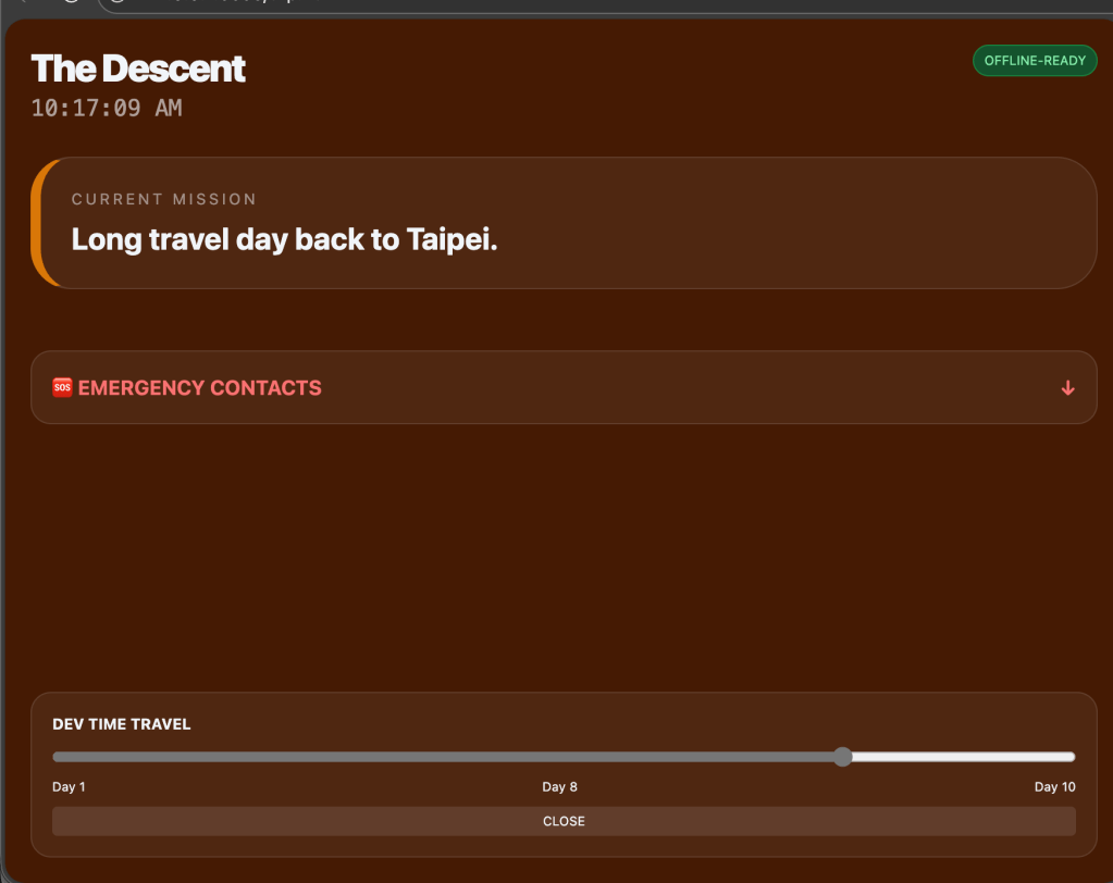 - “Test Mode”: A hidden time-travel slider so I could control which day the app was showing to verify themes and schedules before the trip.